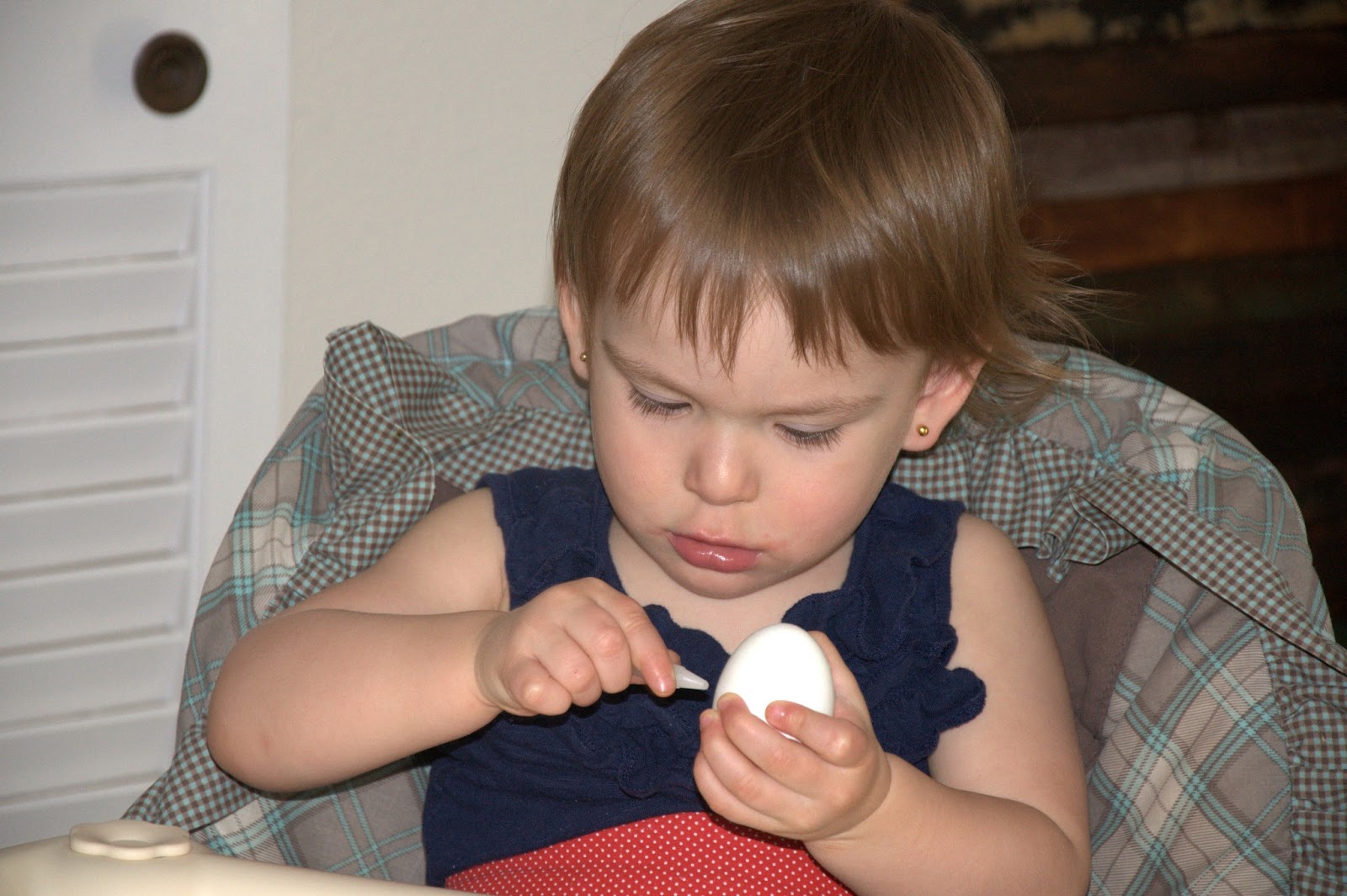 Saturday - Nana came over to help us dye Easter eggs today. Maddie greatly enjoyed the event. We let her drop the color pellets in the water, then color on the eggs, drop them in the dye bowls, and the pull them out when they were done. There were a few casualties, but overall she did amazing for an 18 month old. We did 2 dozen eggs, then we took them out in the backyard and I hid them for her. She caught on real quick and "found" them all fairly quickly. Her little "basket" was full to the brim and on the last egg she fell down and broke just about all of them. She looked up and said, "uh o". She definitely enjoyed the day. See the video HERE.